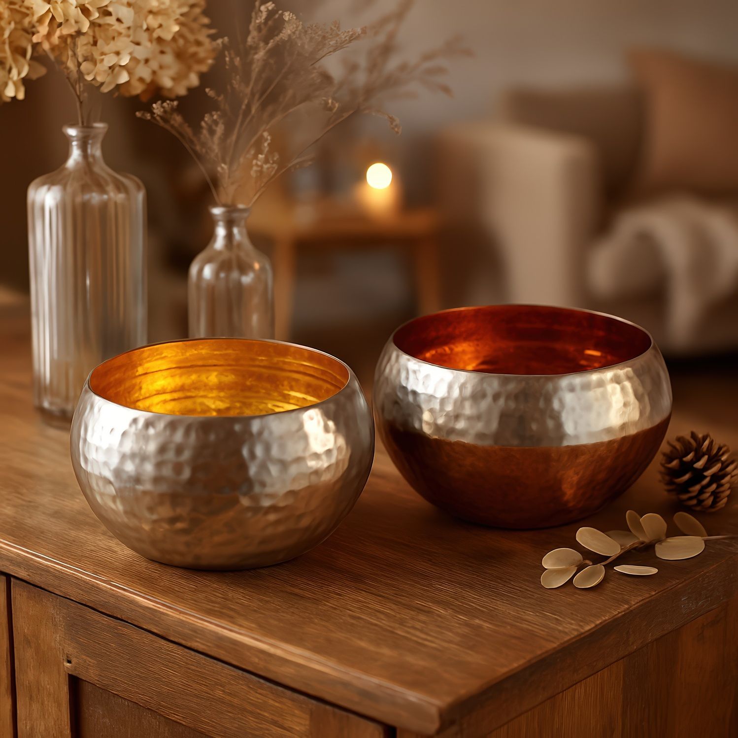 Stilvolle Deko-Schale aus Metall mit glĂ€nzender InnenflĂ€che in Gold oder Kupfer. Ideal als Windlicht mit Kerze oder als elegante Dekoration fĂŒr Tisch, Sideboard und Wohnzimmer.