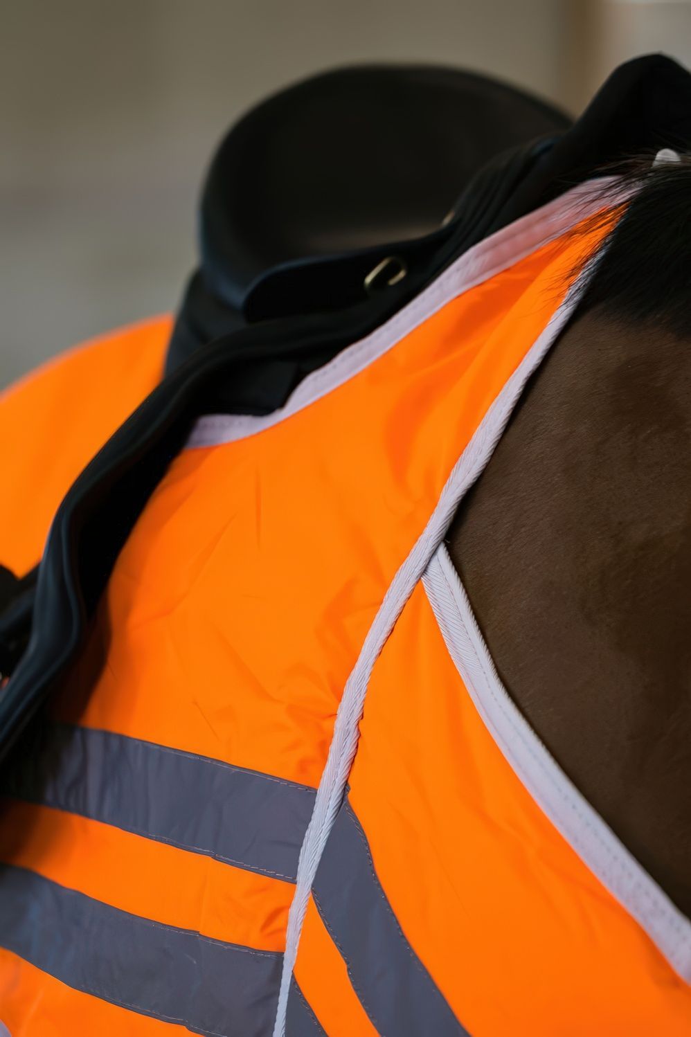 Ausreitdecke mit Brustlatz und großflĂ€chigen, rundum laufenden Reflektorstreifen, fĂŒr gute Sichtbarkeit in der Nacht.