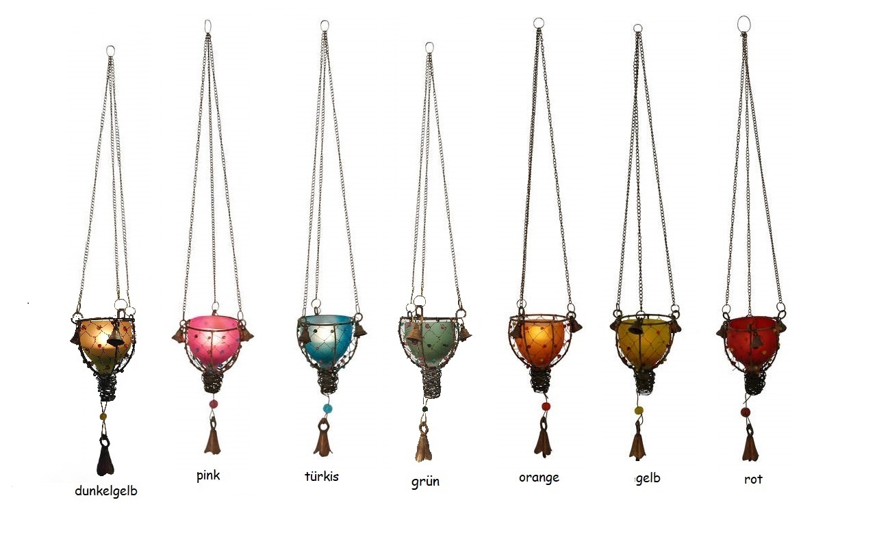 Windlicht Teelichthalter mit Glöckchen zum Hängen aus farbigem Glas und Metall
