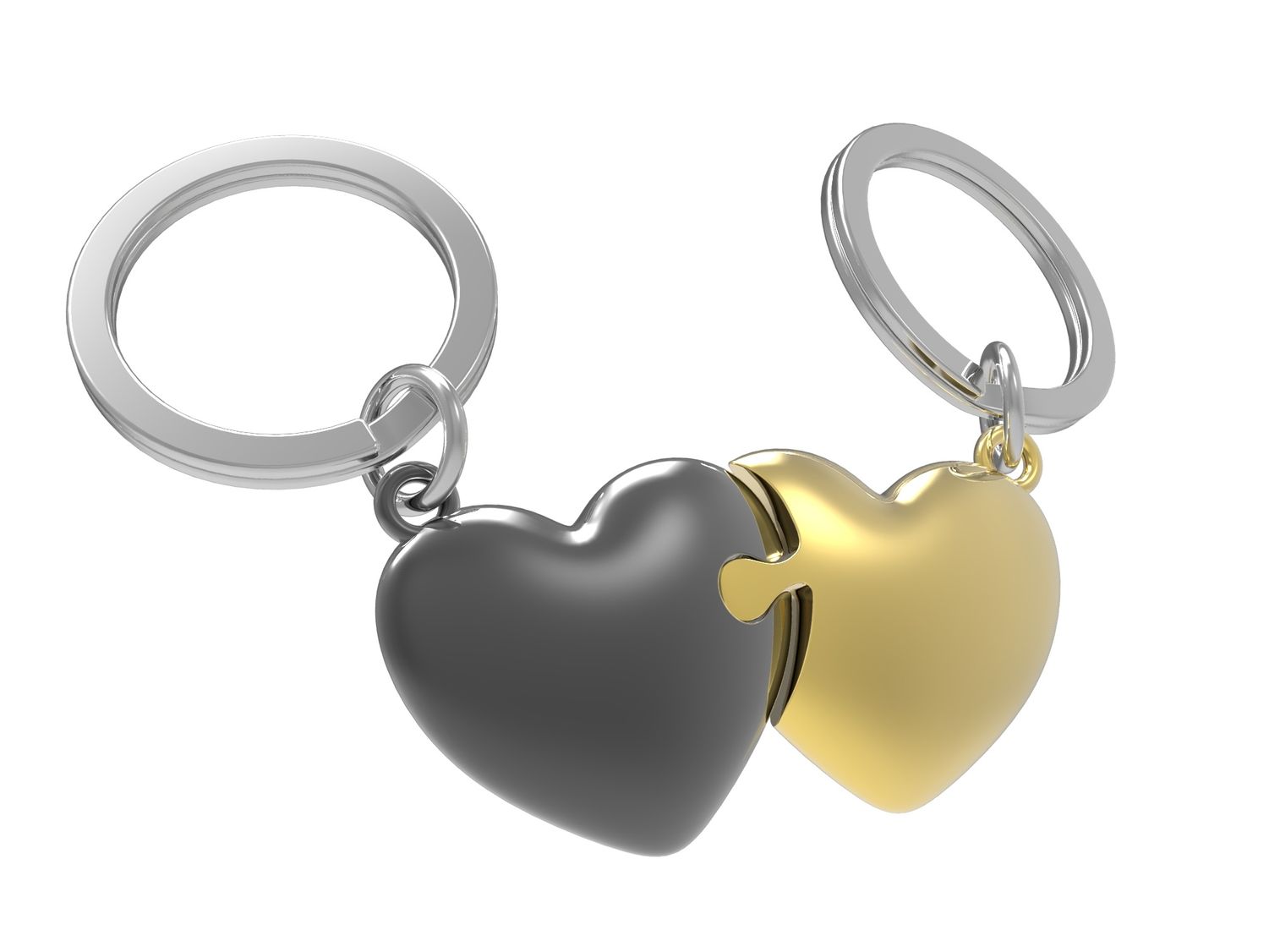 Zwei SchlĂŒsselanhĂ€nger mit Herzen, die wie ein Puzzle ineinandergreifen