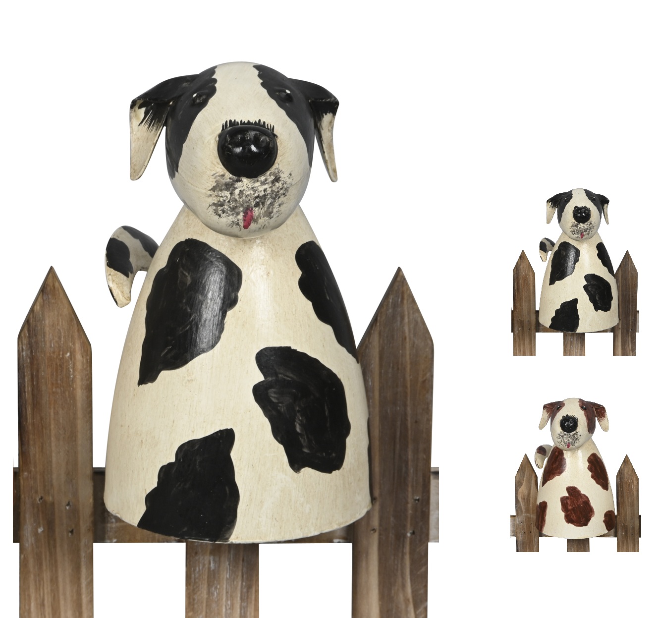 SĂŒĂŸe und dekorative Hunde mit geflecktem Fell als Zaunhocker.