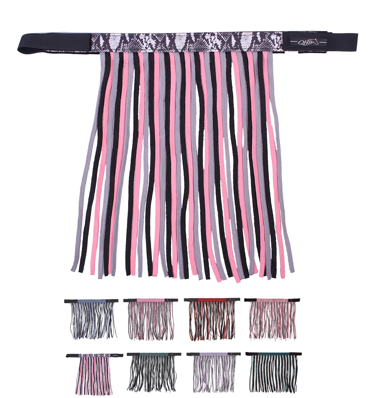 Die Fliegenfransen sind einfach mit Klettverschluss am Halfter zu befestigen. Der Frontriemen ist mit einem auffallenden Muster versehen.