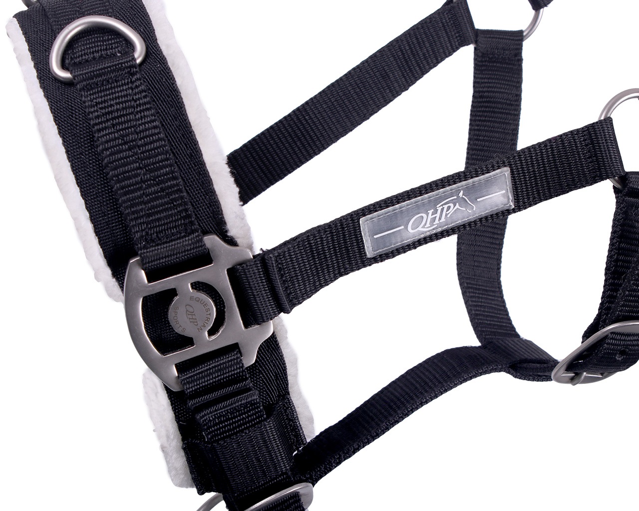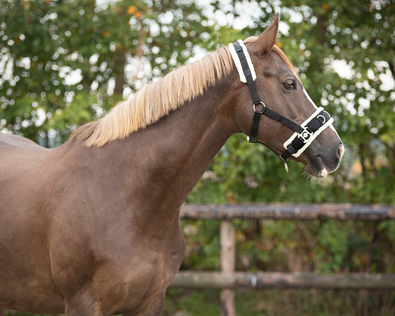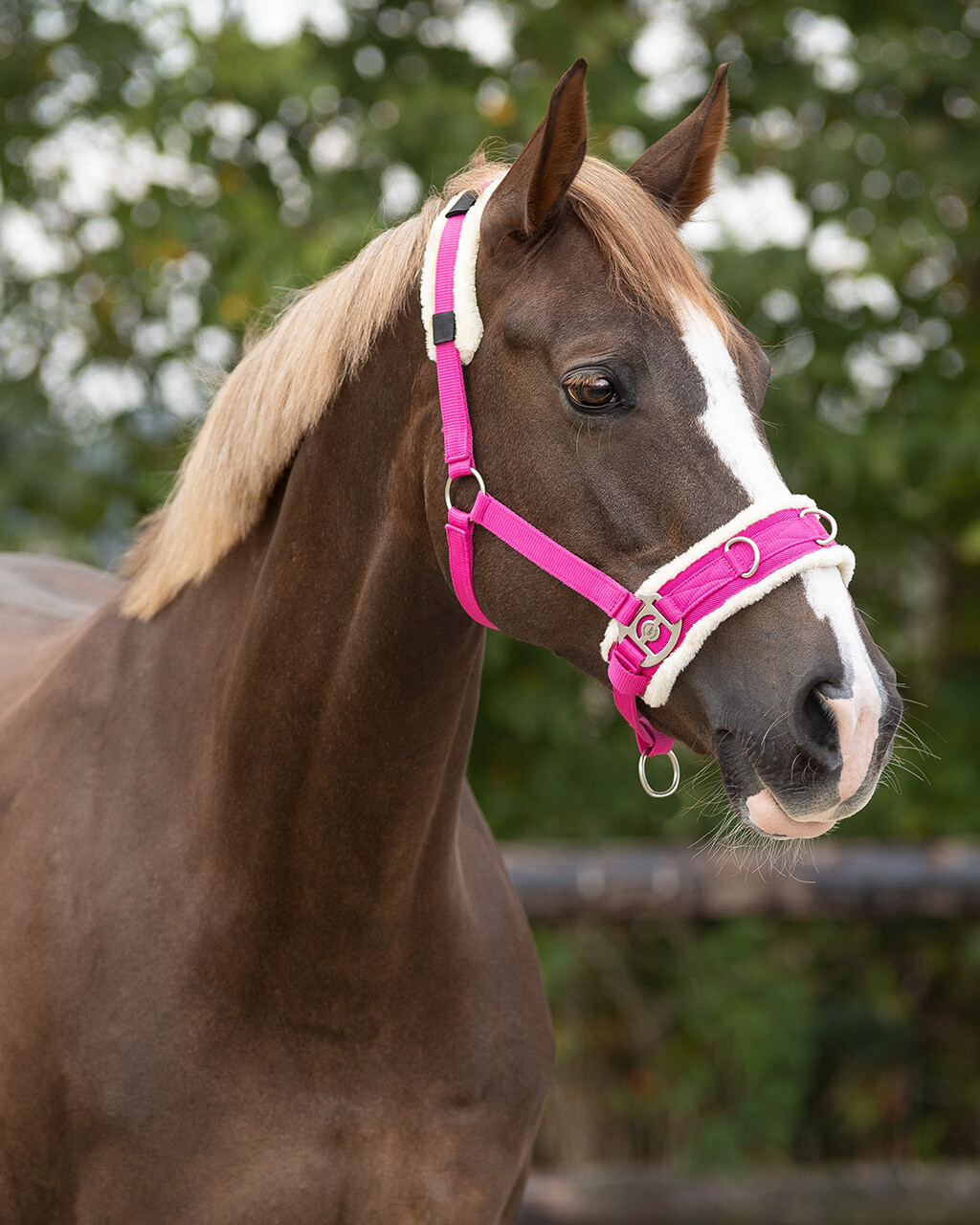 Kunststoff Kappzaum mit 3 Edelstahl D-Ringen auf dem Nasenriemen. Er ist 3-fach verstellbar und am Nasenriemen und Kopfstück mit Kunstfell unterlegt.