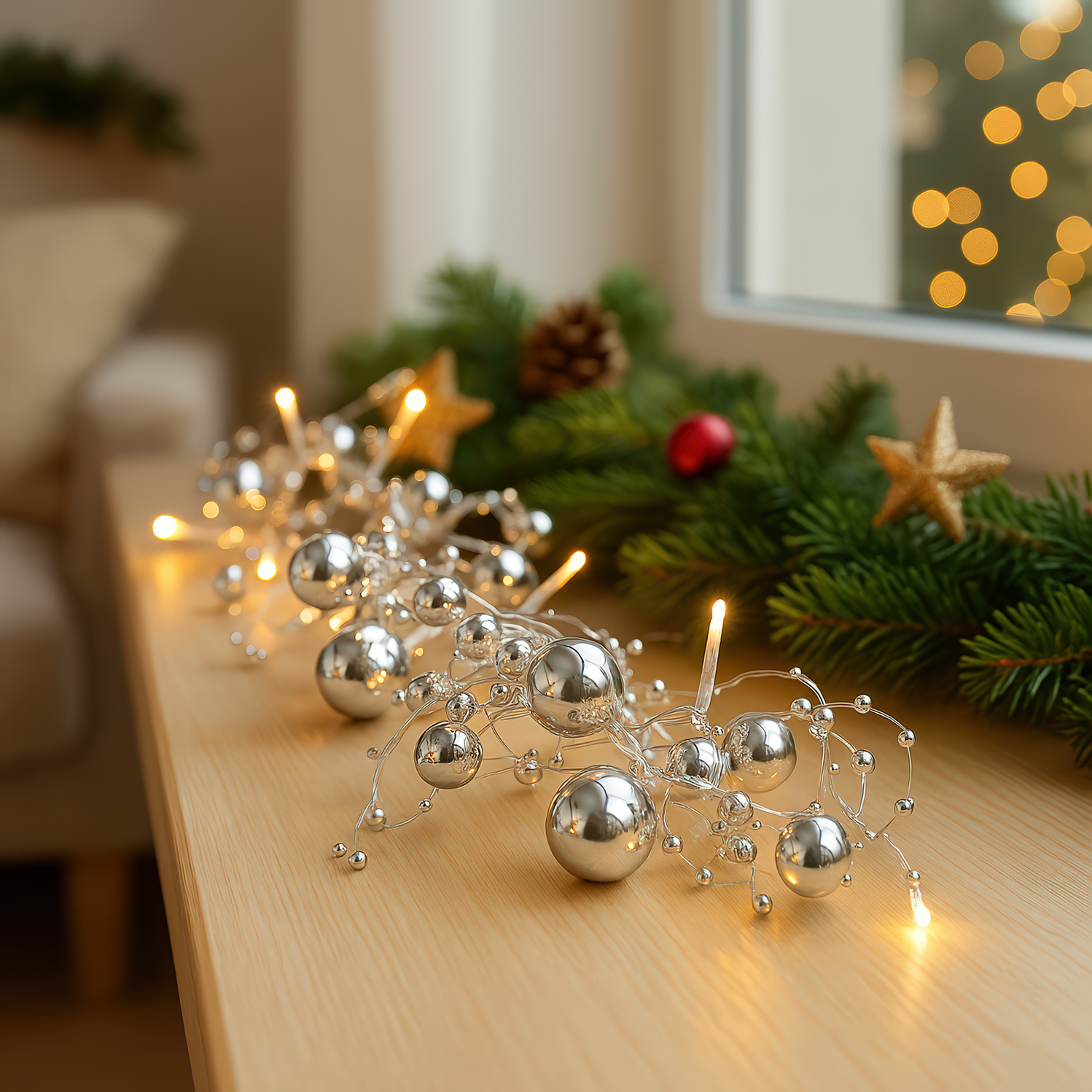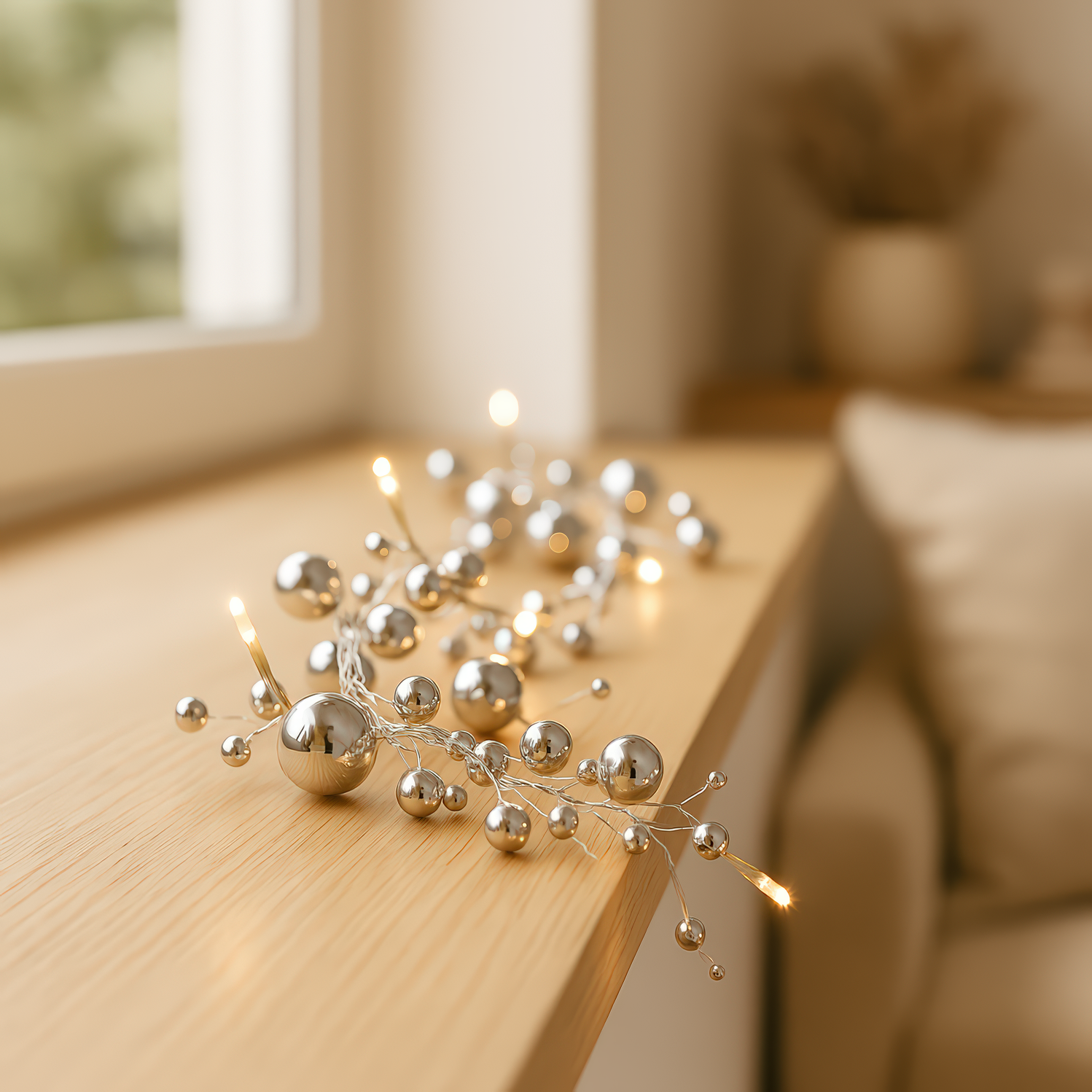VersprĂŒhen Sie Glanz und Glamour durch diese verspielte Dekorationskette mit ihren unterschiedlich großen silberfarbenen Perlen