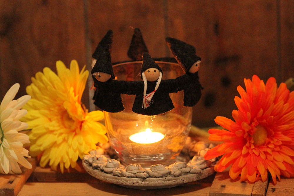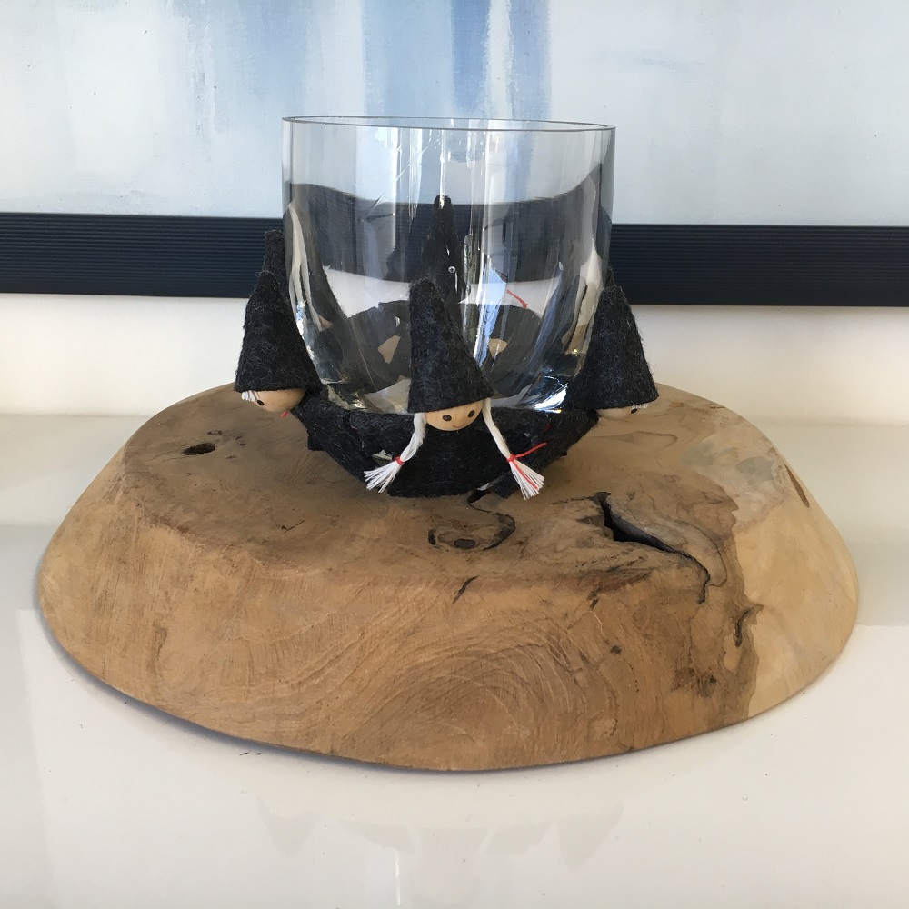 Liebevoll handgearbeitete Wichtel, die sich an der Hand halten und im Kreis um die Kerze tanzen.