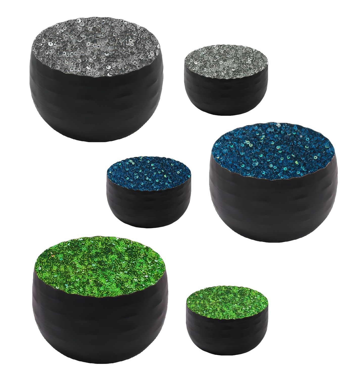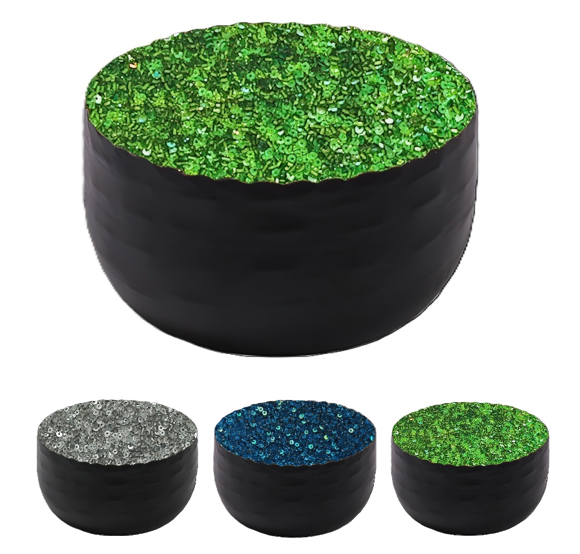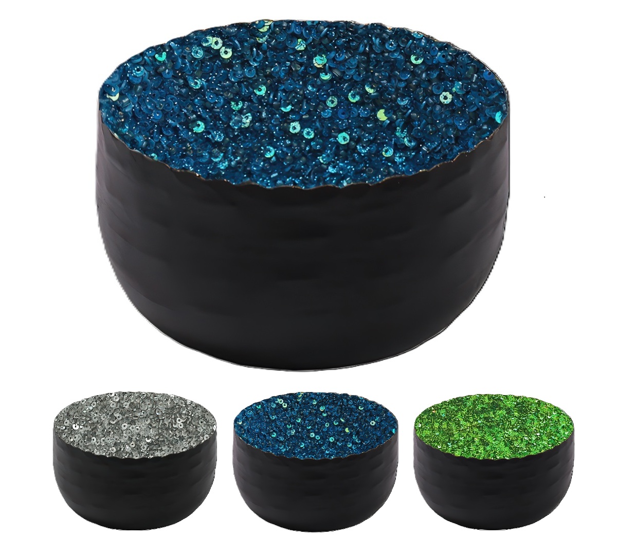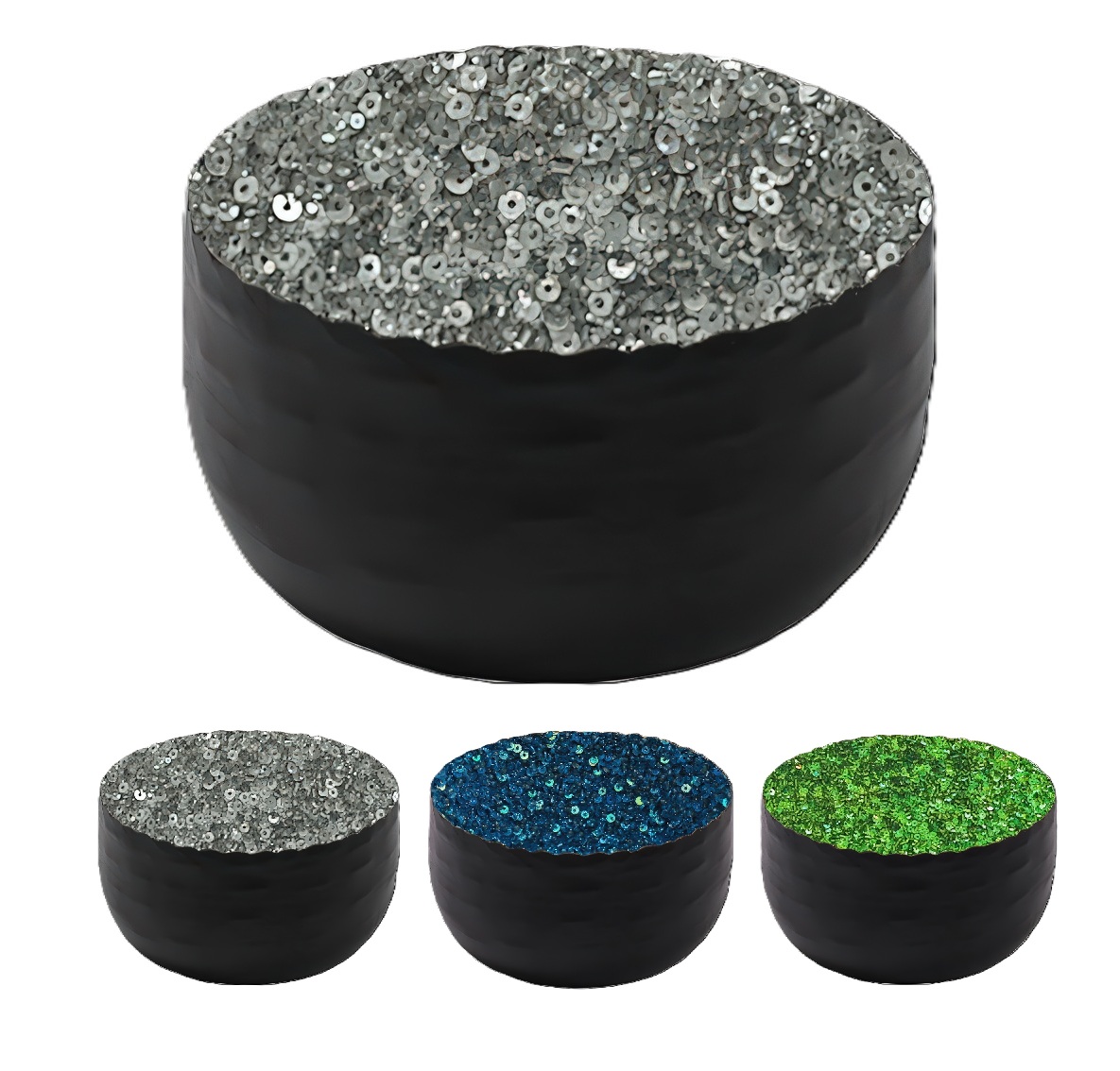 Elegante Dekoschale mit mattschwarzer Außenseite und glitzernder Pailletten-Innenseite.