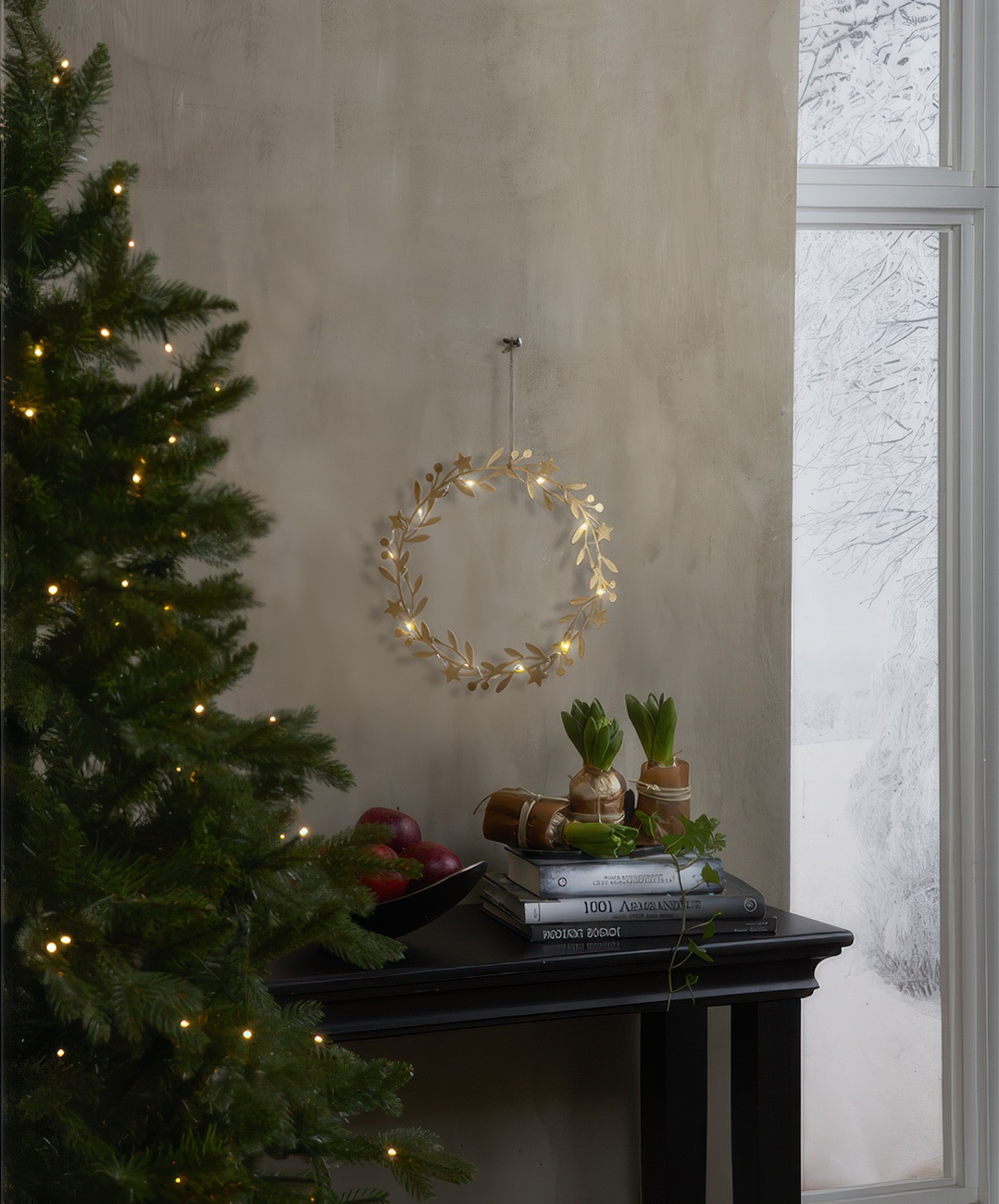 Stimmungsvoller, goldfarbener Metallkranz mit ausgestanztem Mispelmuster. Im Kranz leuchten 10 kleine LED-Punkte.