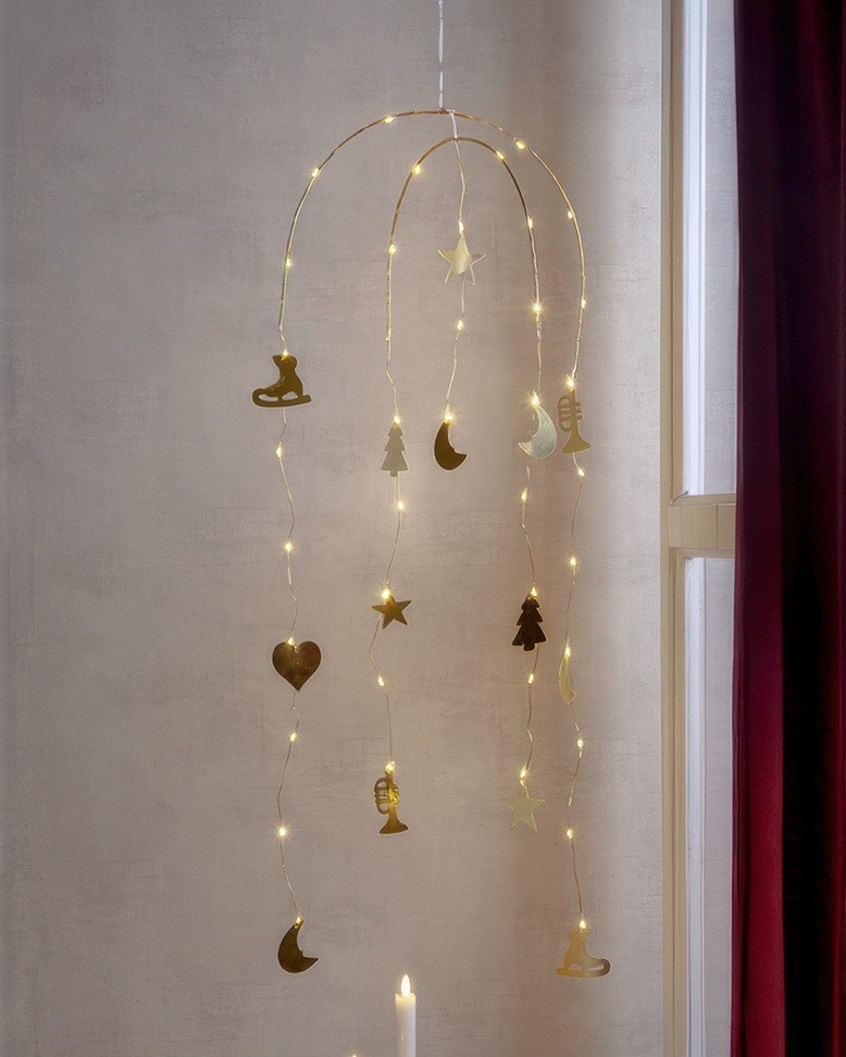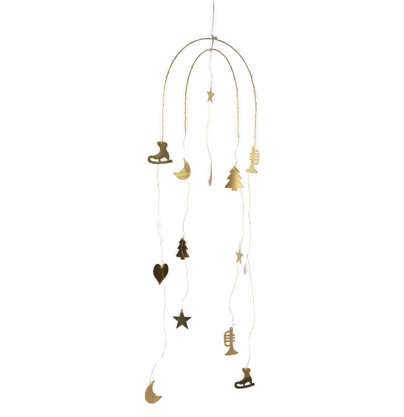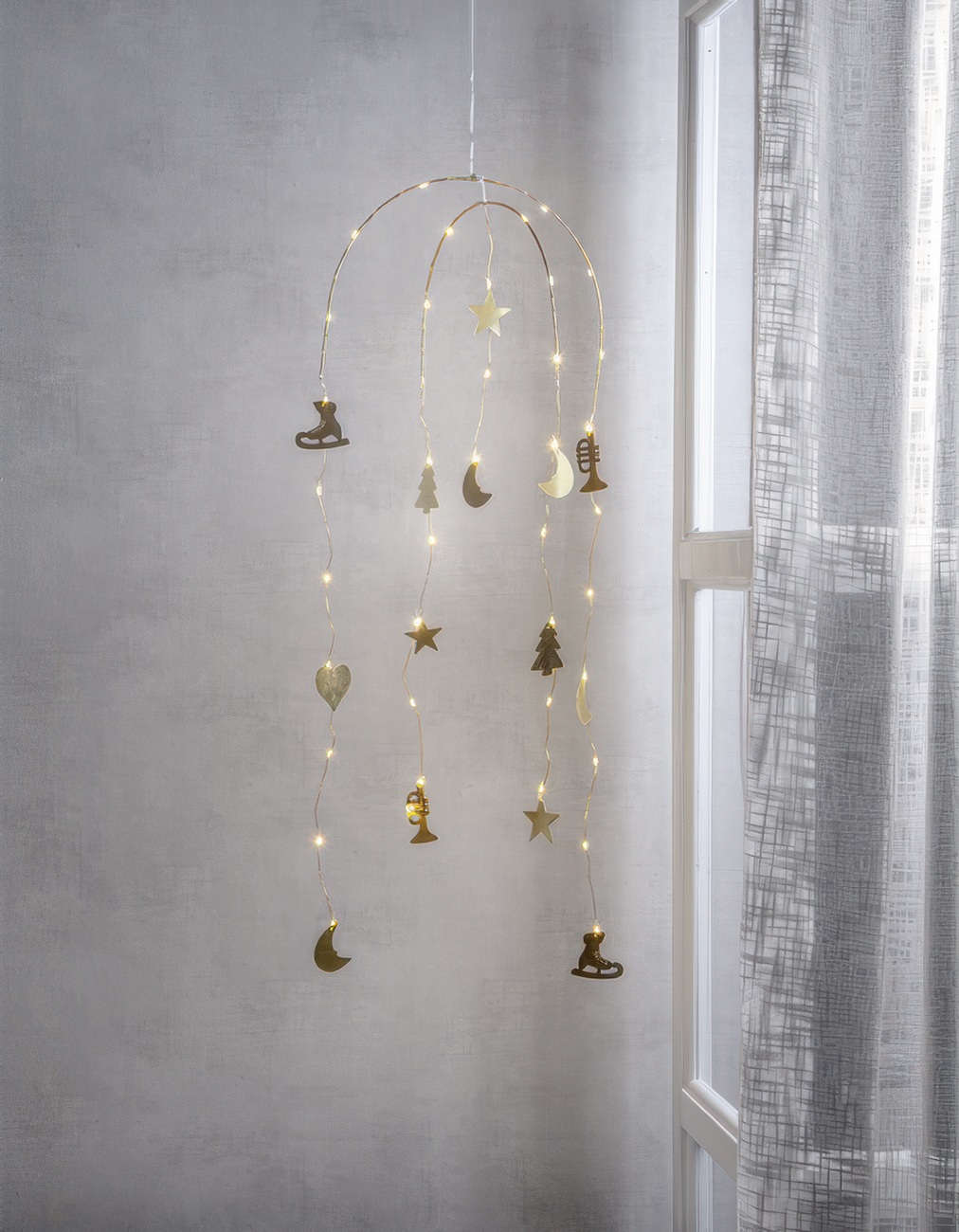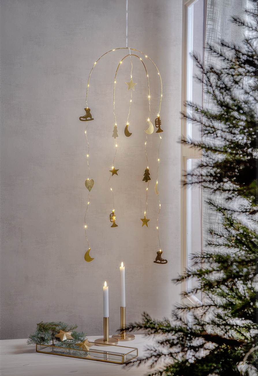 Hängendes dekoratives Mobile mit Beleuchtung. Es zeigt schöne Wintermotive aus Messing, die für Weihnachtsstimmung sorgen. Die kleinen Lichtpunkte spiegeln sich schön in den winterlichen Messingornamenten wider und geben ein dezentes Leuchten ab. Das extra lange Kabel erleichtert das Aufhängen über einem Fenster oder in einer dunklen Ecke. Das Mobile wird mit Batterien betrieben (nicht enthalten).