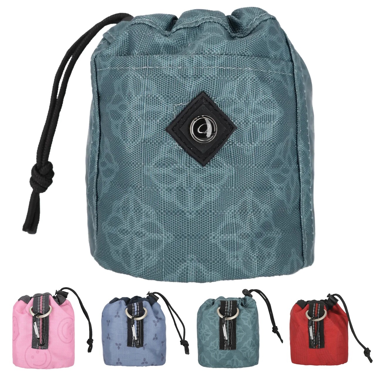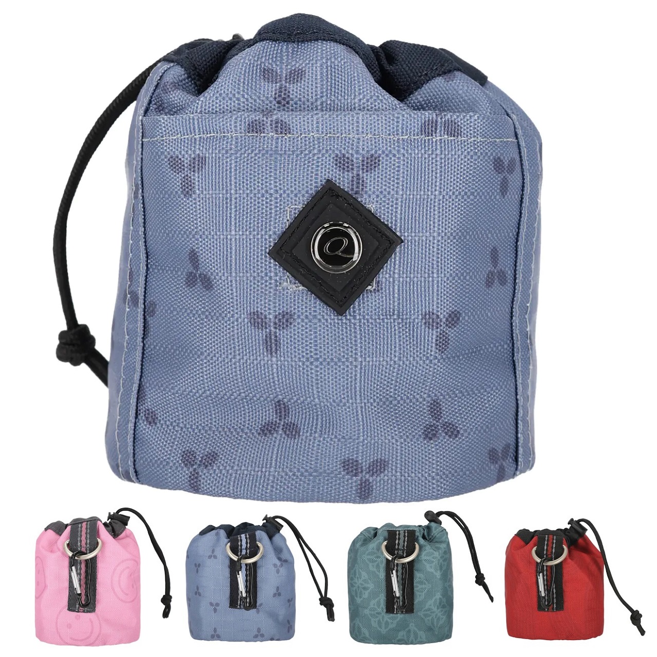 Kleine Tasche, in der Leckerlis oder andere essbare Belohnungen aufbewahrt werden können. Die Tasche kann mit der Schlaufe mit D-Ring, dem Karabiner und zwei Schlaufen auf der RĂŒckseite auf verschiedene Weise befestigt werden.