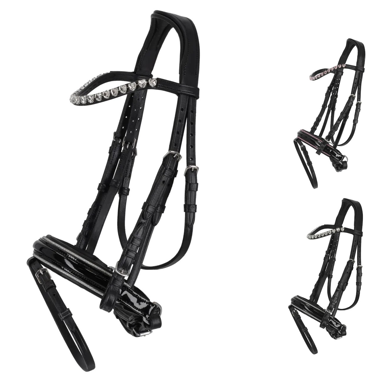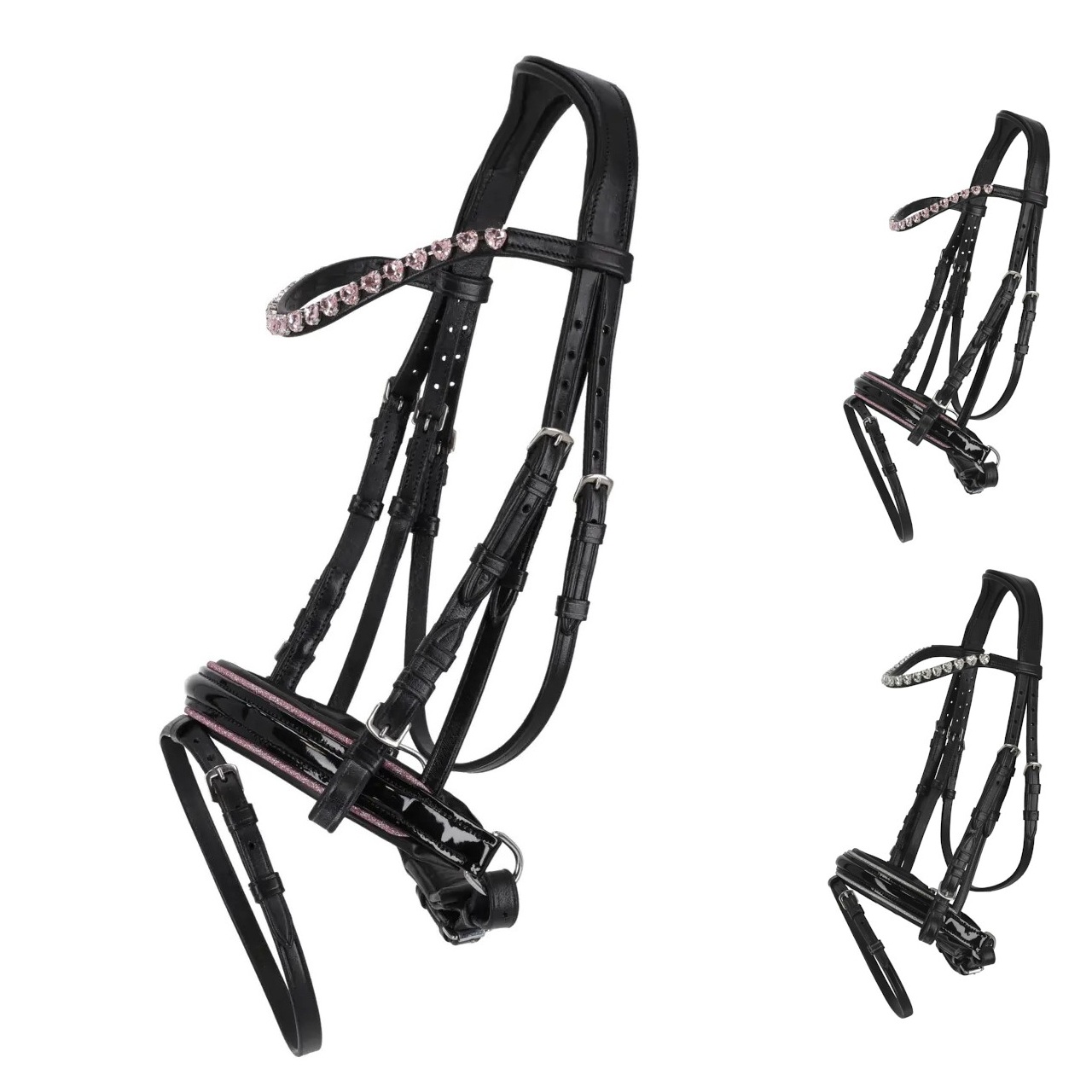 Der Nasenriemen dieser Trense aus schwarzem Leder besteht aus Lackleder mit dezentem Glitzerrand. GenickstĂŒck, Nasenriemen und Nasenriemenverschluss sind weich gepolstert, was zusĂ€tzlichen Tragekomfort bietet. Die herzförmigen Strasssteinchen auf dem Stirnriemen verleihen der Trense eine besonders elegante Ausstrahlung. Das anatomisch geformte, gepolsterte GenickstĂŒck bietet deinem Pony eine bessere Passform und ein angenehmes TragegefĂŒhl.