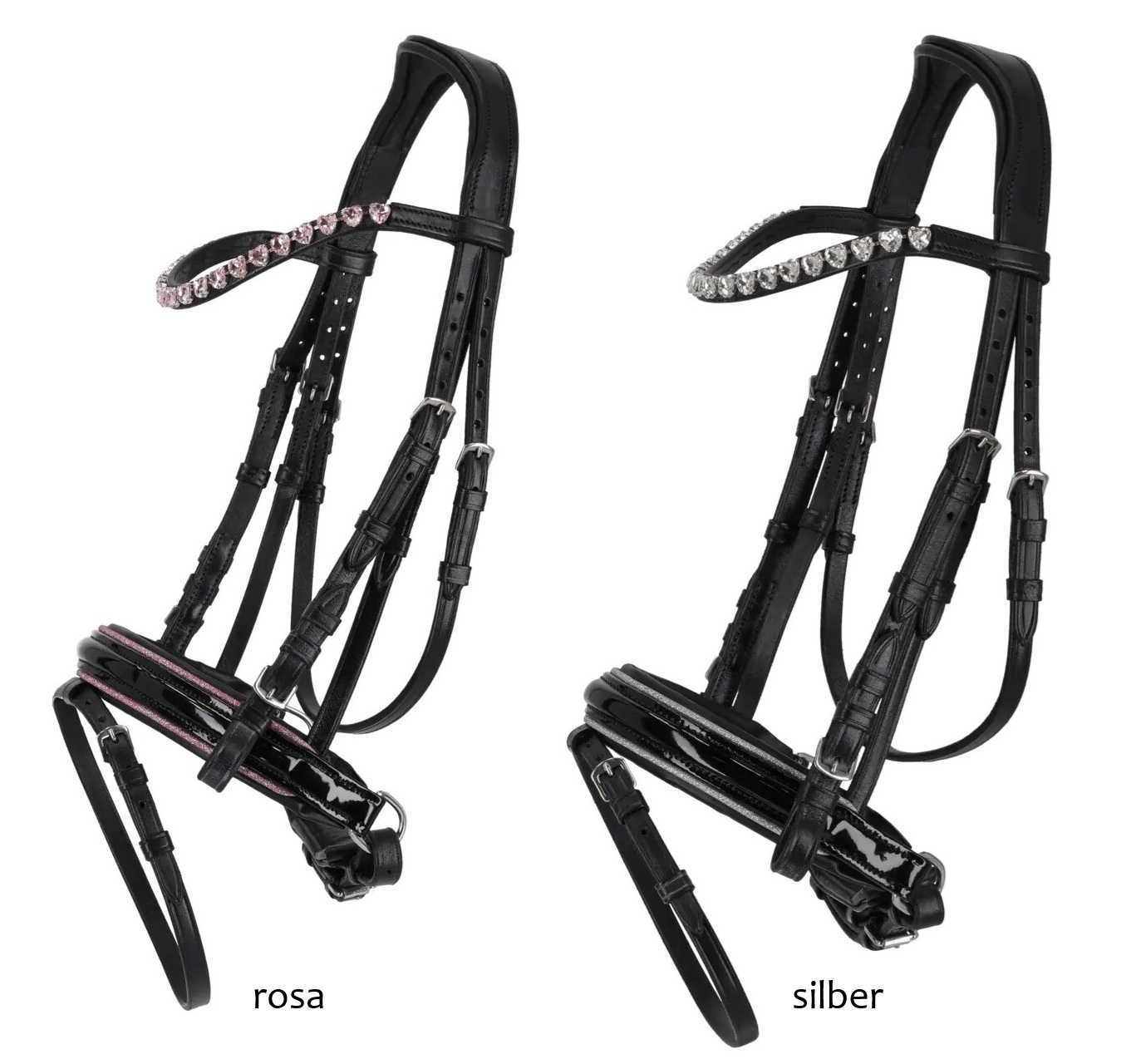 Die herzförmigen Strasssteinchen auf dem Stirnriemen verleihen der Trense eine besonders elegante Ausstrahlung