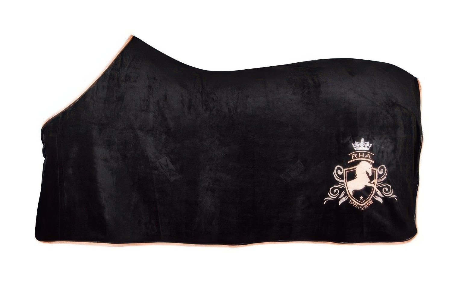 Produktdetails: Weiche Fleecedecke -Â Â Frontverschluss - Kreuzbegurtung - Schweifkordel - Wappenstickerei mit Glitzerdruck