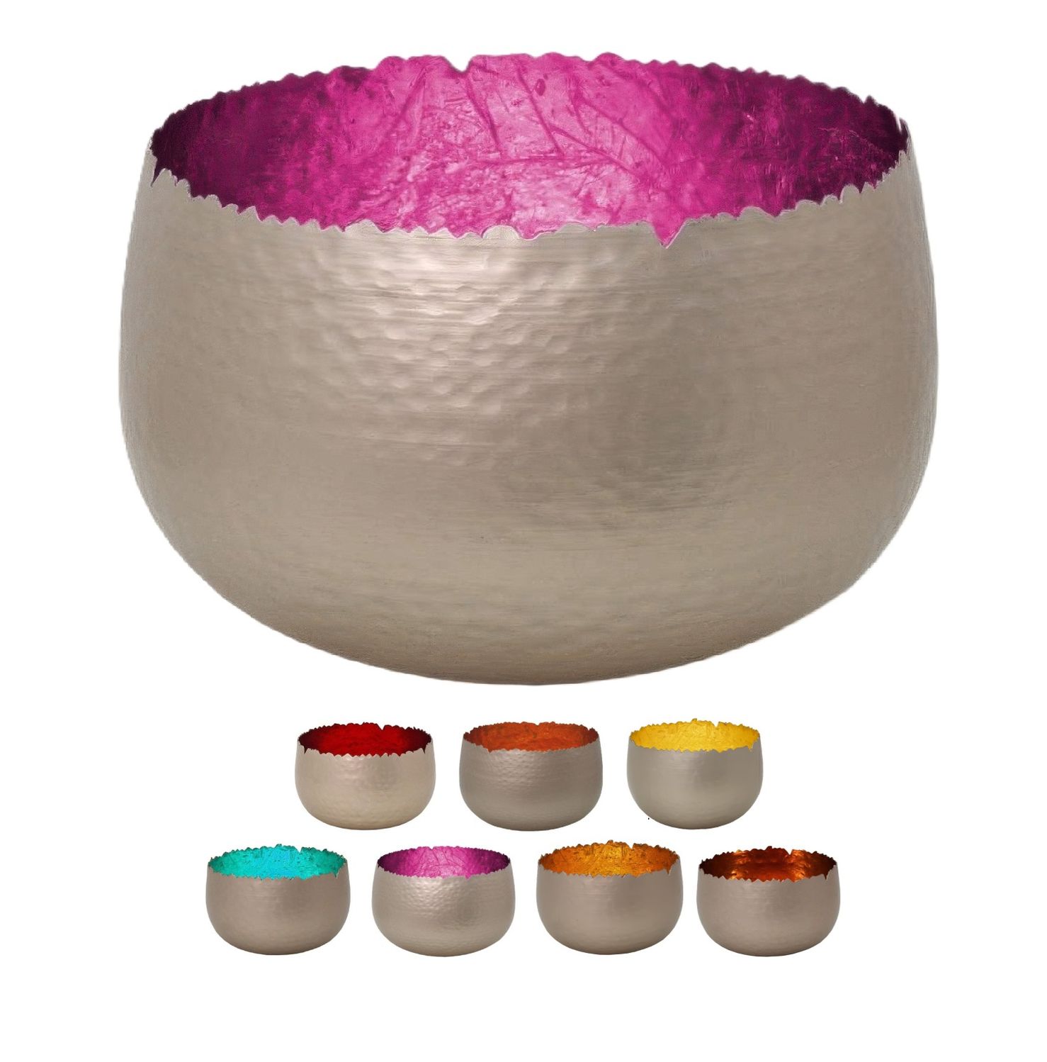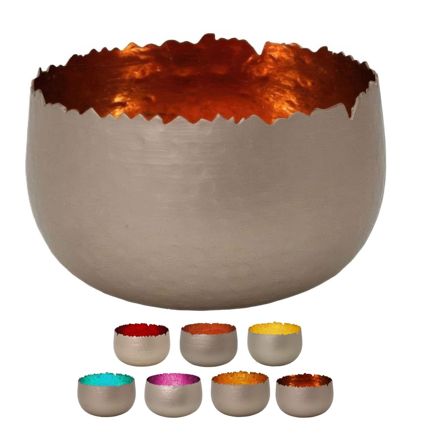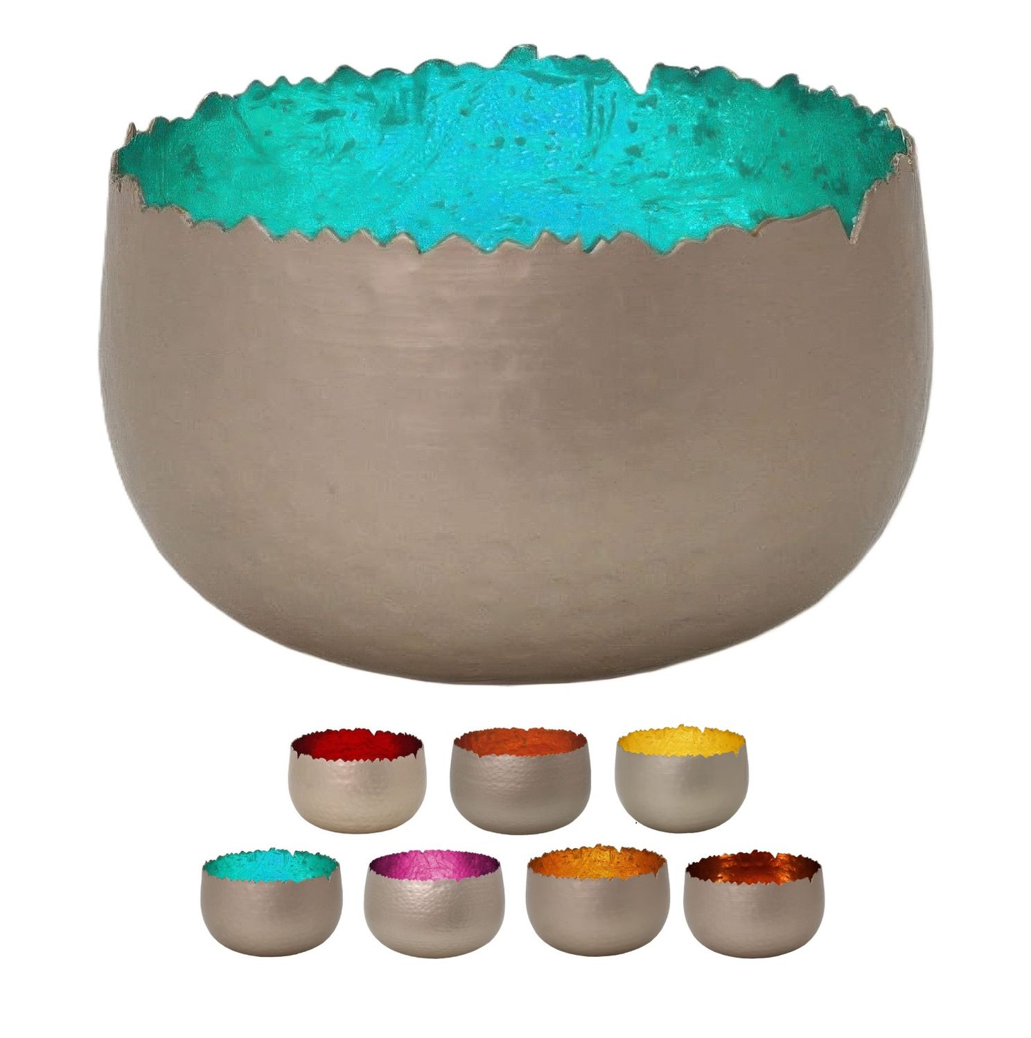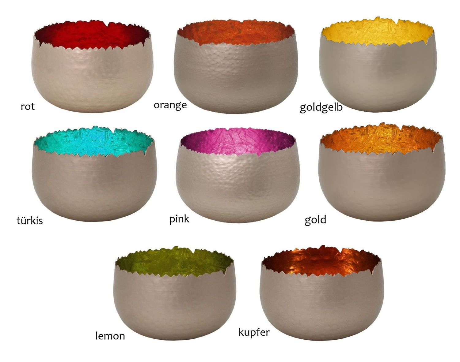Durch die besondere Beschichtung im Inneren der Schalen erscheint es als ob die Schale leuchtet. Dieser Effekt wird noch verstÀrkt, wenn ein Teelicht oder eine Lichterkette in die Schale gelegt wird.